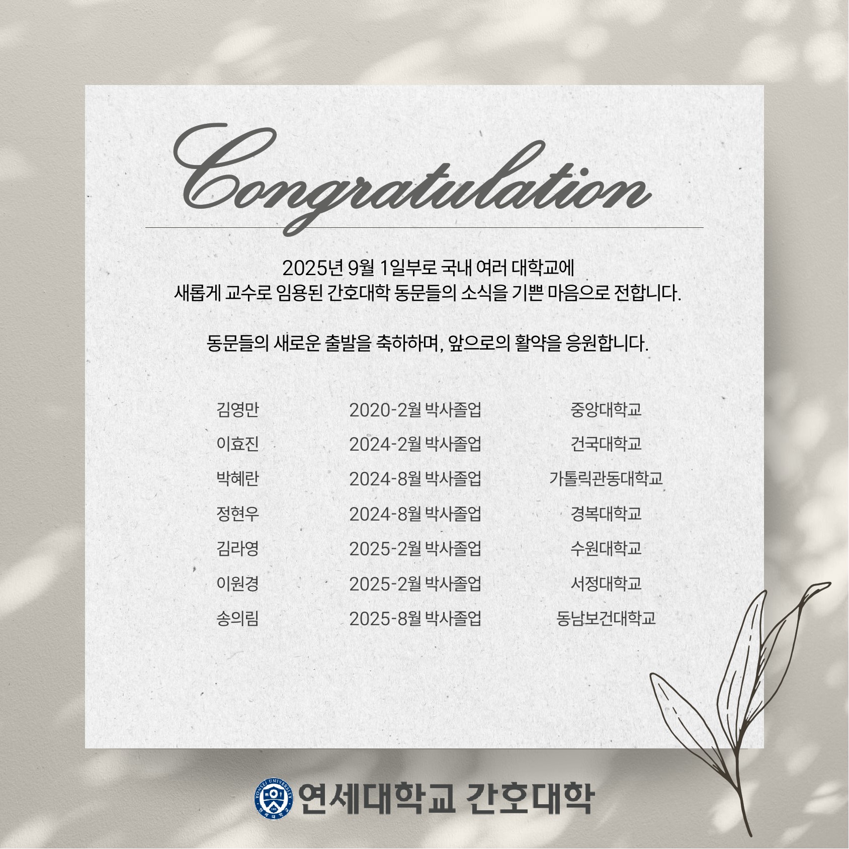 News 간호대학 동문 신규 임용 안내_2025. 9. 1.부 관리자 2025-09-03 조회수 978 공유하기 공유하기 페이스북 네이버블로그 카카오톡 카카오스토리 닫기 목록 이전글간호대학, 실습경험 성찰활동 우수 에세이 시상식 개최 다음글연세대학교 간호대학생, '유일한 아카데미' 수상
