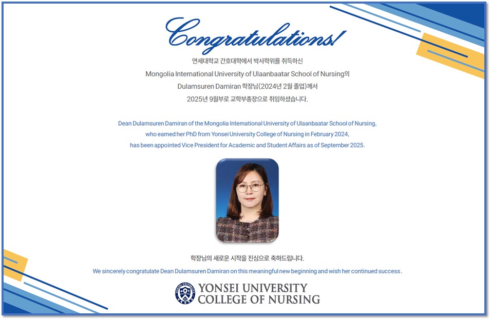 News [Spotlight] Appointment of Dean Dulamsuren Damiran as Vice President for Academic and Student Affairs 관리자 2025-09-12 조회수 449 공유하기 공유하기 페이스북 네이버블로그 카카오톡 카카오스토리 닫기 목록 이전글연세대학교 간호대학생, '유일한 아카데미' 수상 다음글연세대 간호대학 석사과정생 3명, 홍콩중문대 PhD Summer Workshop 추천 및 참여