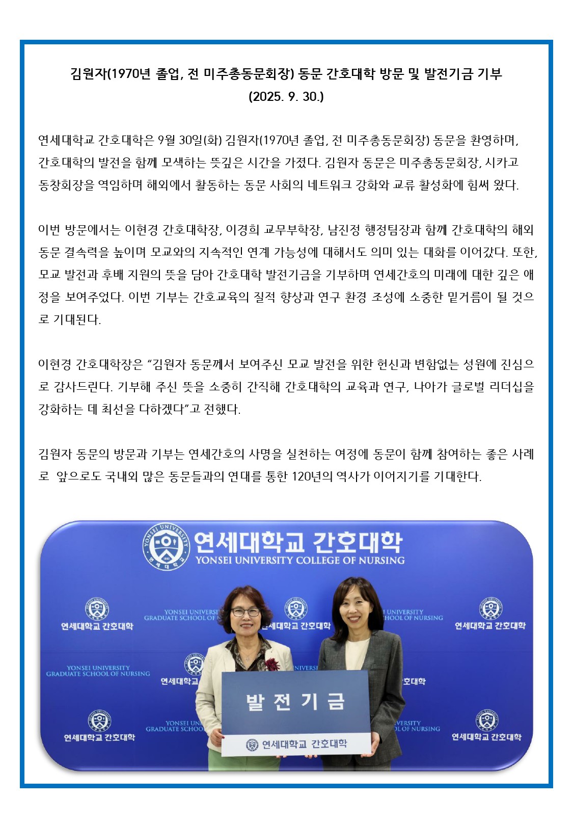 News 김원자(1970년 졸업, 전 미주총동문회장) 동문 간호대학 방문 및 발전기금 기부 [2025.09.30] 관리자 2025-10-01 조회수 221 공유하기 공유하기 페이스북 네이버블로그 카카오톡 카카오스토리 닫기 목록 이전글연세대학교 간호대학, 메풀 전산초 명예교수 기념 학술대회 개최 "차세대 간호과학자 양성: 혁신적 연구·교육·정책” 주제로 미래 발전 방향 모색" 다음글다음글이 없습니다.